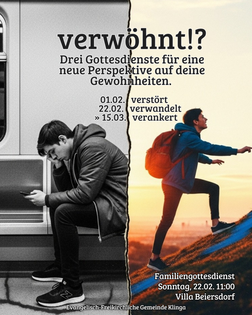 Herzliche Einladung zum dritten Familiengottesdienst zum Motto „ver-wöhnt“. Am Sonntag, den 15.03.2026 treffen wir uns wieder 11:00 Uhr in der Villa Beiersdorf um Gott zu Loben und uns von ihm ansprechen zu lassen. Nach den letzten beiden Predigten (verstört: wir brauchen Irritation, damit negative Muster aufgedeckt werden und verwandelt: eine Pflanze muss teilweise zurückgeschnitten werden, damit sie Kraft für andere Teile hat) fragen wir dieses Mal: Wie ist eigentlich das Wort Gottes in uns verankert? Denn alles „ver-wöhnen“ soll darauf zielen, unserem Gott als Herrn über unser Leben zu vertrauen.